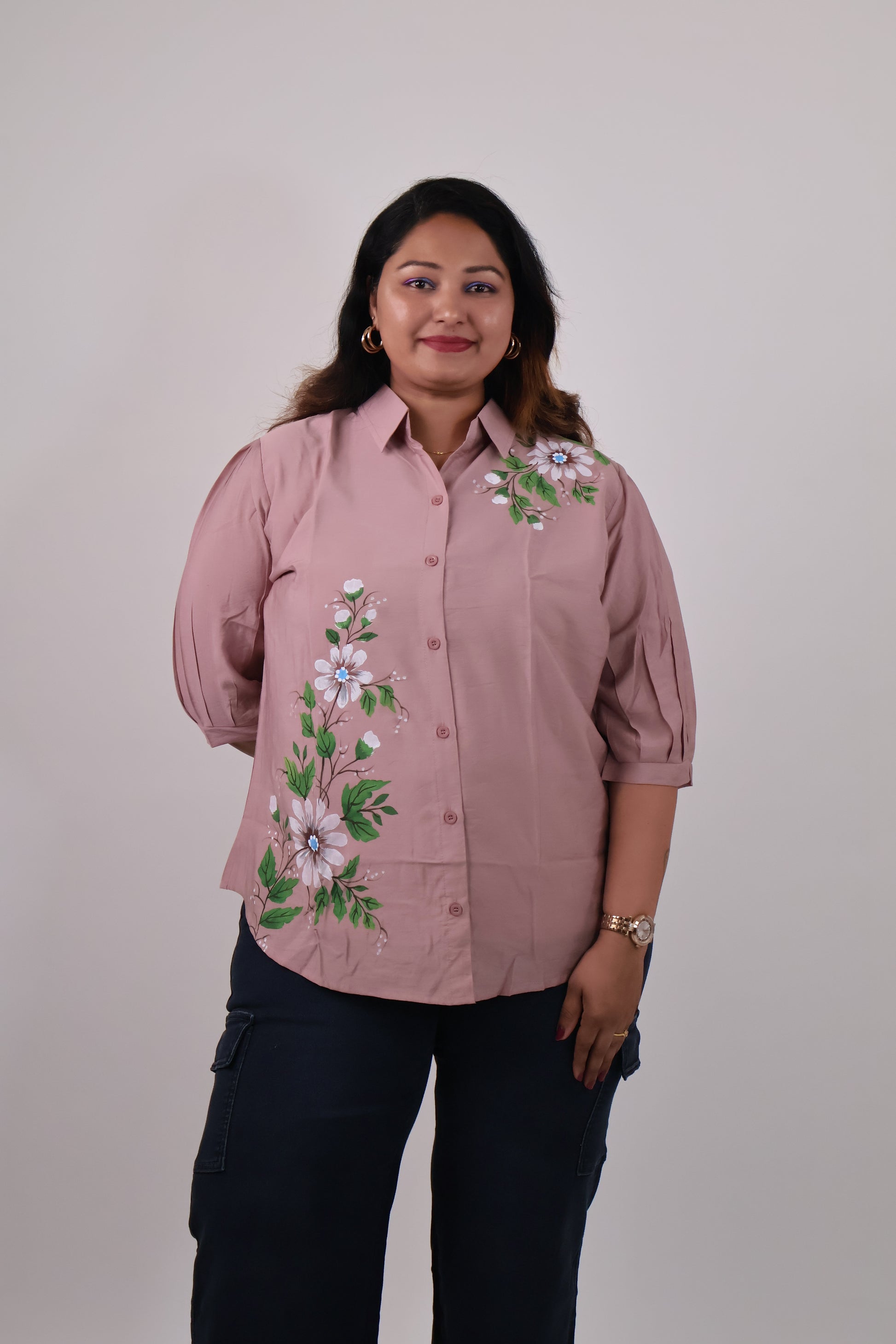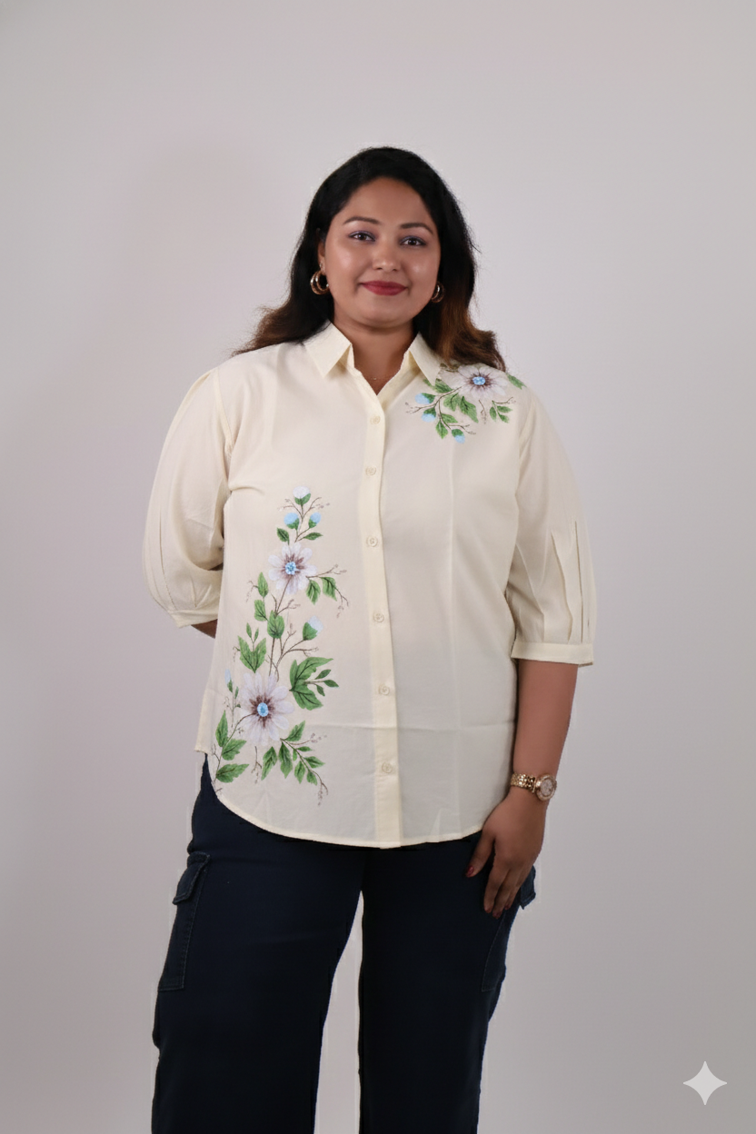 This button-down shirt is adorned with elegant handpainted floral motifs that add a soft, artistic touch to a classic silhouette. Designed with a relaxed fit and gently pleated sleeves, it offers comfort without compromising on style. The subtle detailing makes it perfect for both workdays and casual outings.